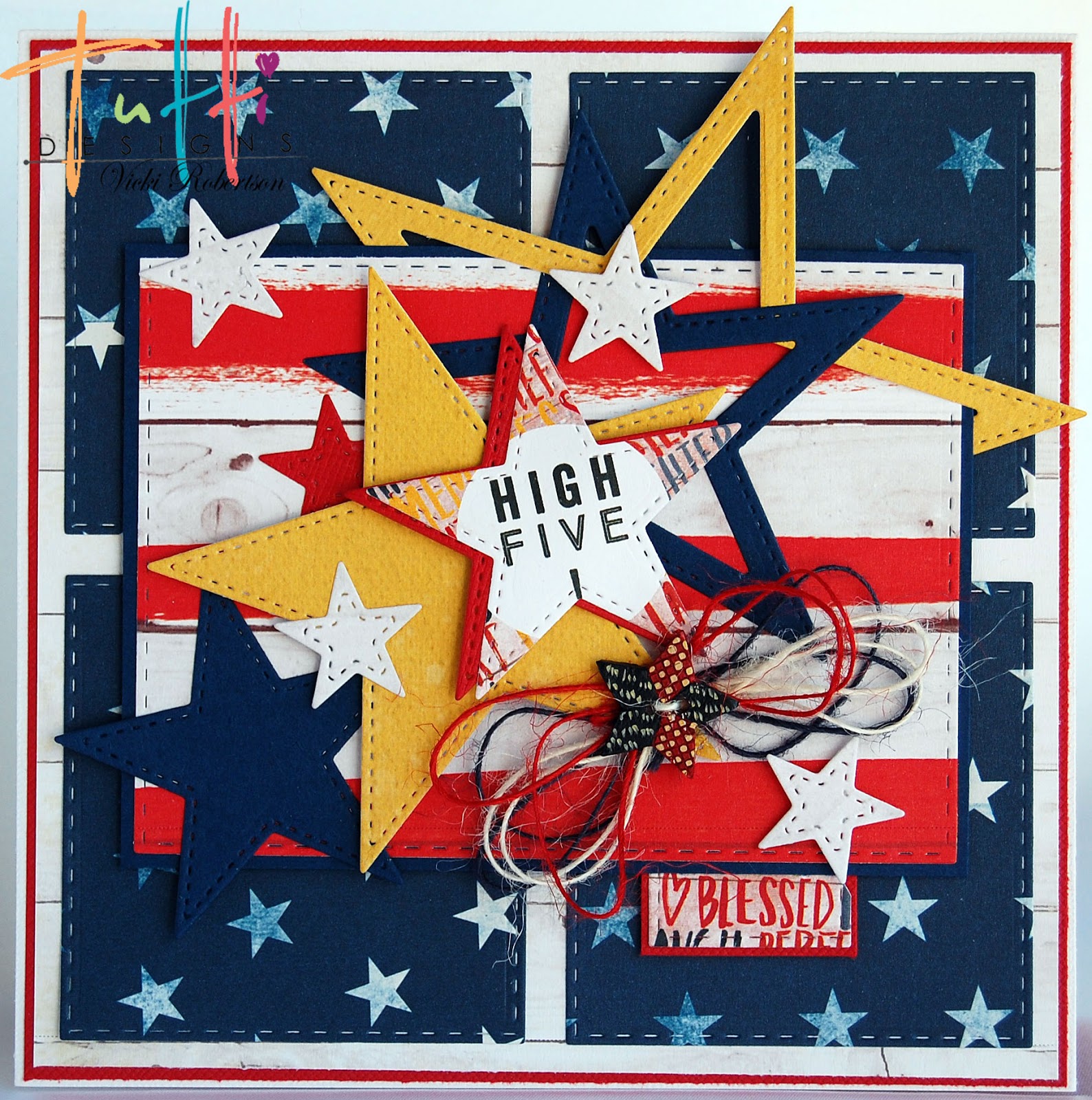 I die cut the "High Five" from the patterned paper and used it as the focal sentiment along with a drop down tag "Blessed". A twine bow and wooden button of red, white and blue complete the details.